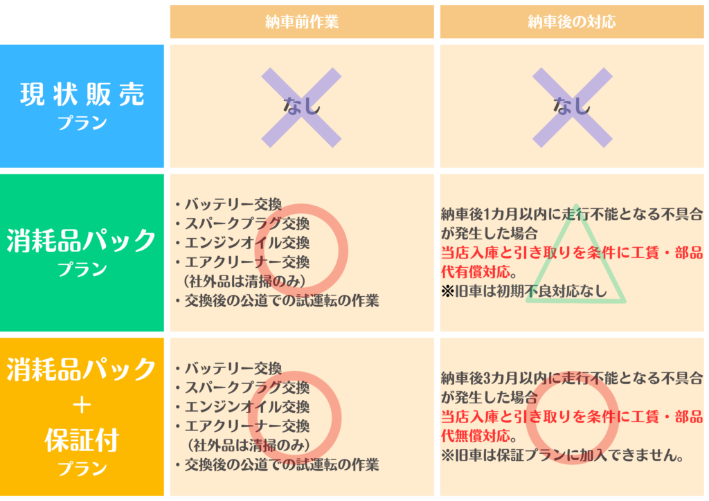 仕入れた車両をそのまま販売してるのではなく、入庫時点検や試運転をおこなってから販売しています。車両販売のみに特化した業態ですが、ご希望の方には安心を追加した